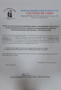 O Centro de tradições Gaúchas Fogo de Chão – CTG FOGO DE CHÃO, Município de Itanhangá MT, neste ato representado por seu PATRÃO Glauco Bergamo, no uso de suas atribuições previsto no Art. 32 II, do Estatuto, CONVOCA toda a comunidade de Itanhangá, através do presente Edital, para a ASSEMBLÉIA GERAL EXTRAORDINÁRIA, conforme dispões o art. 67, que será realizada no dia 04 de dezembro de 2025 às 19:00 (dezenove) horas , a ser realizada na Câmara Municipal de Itanhangá, localizada na Rua Florianópolis, nº 217, Centro, Itanhangá MT, CEP 78.579-000, com a seguinte ordem do dia: